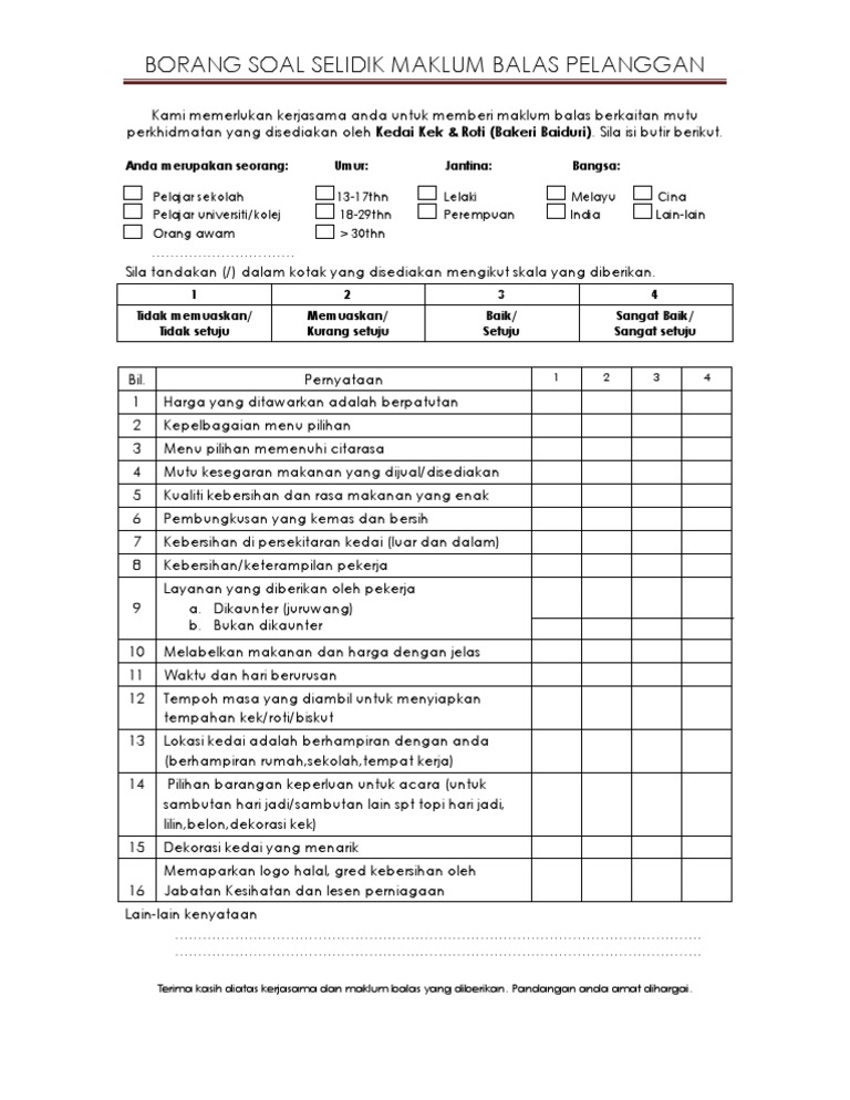 Doc Borang Soal Selidik Tahap Kepuasan Pelancong Terhadap Restoran Makanan Laut Di Waterfront Kota Kinabalu Nur Nabilah Academia Edu