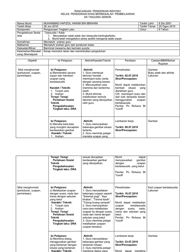 Tingkah Laku Contoh Rpi Murid Pendidikan Khas