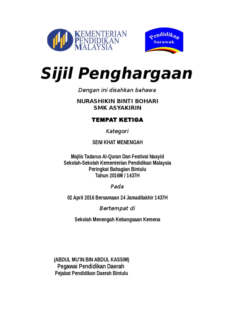 Contoh Sijil Penghargaan Dan Boleh Diedit