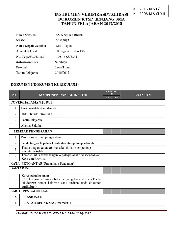 Contoh Instrumen Validasi Verifikasi Dokumen Ktsp Nbsp Web Viewinstrumen Validasi Verifikasi Dokumen Ktsp Kota Dan Pengembanagan Diri Sesuai Dengan Standar Kriteria Kelulusan Docx Document